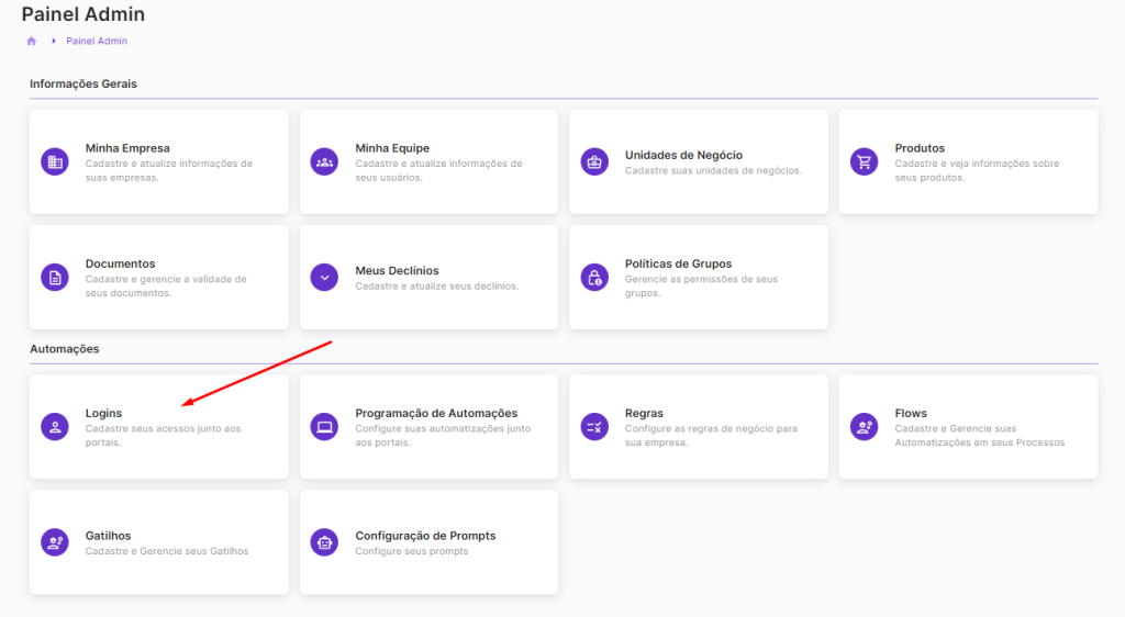 Para cadastrar ou administrar seus logins é muito simples. Basta acessar o Painel Admin disponível na opção ao clicar no ícone de usuário, aquela “bolinha” colorida no canto superior direito, em qualquer tela do sistema você a encontrará. Clicando, virá para esta tela, onde há opção Logins. Clique nela!