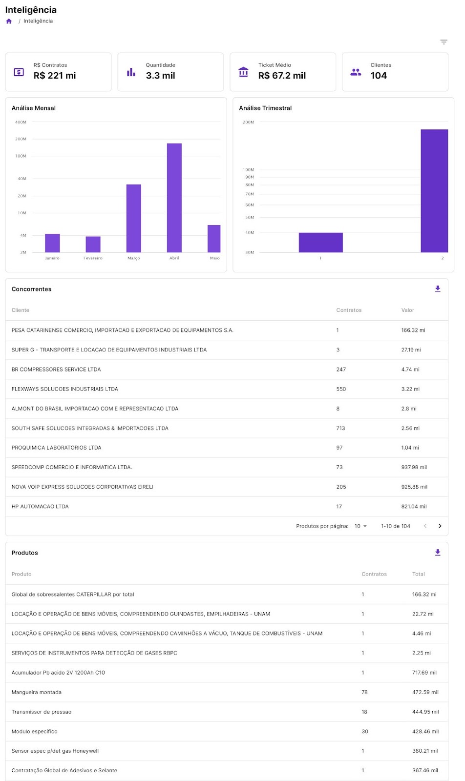 Entre as informações, temos: Valor Total contratado, Quantidade de contratos, Valor Médio dos contratos e Quantidade de fornecedores, além de gráficos com um comparativo mensal, trimestral, os fornecedores destes contratos e produtos.