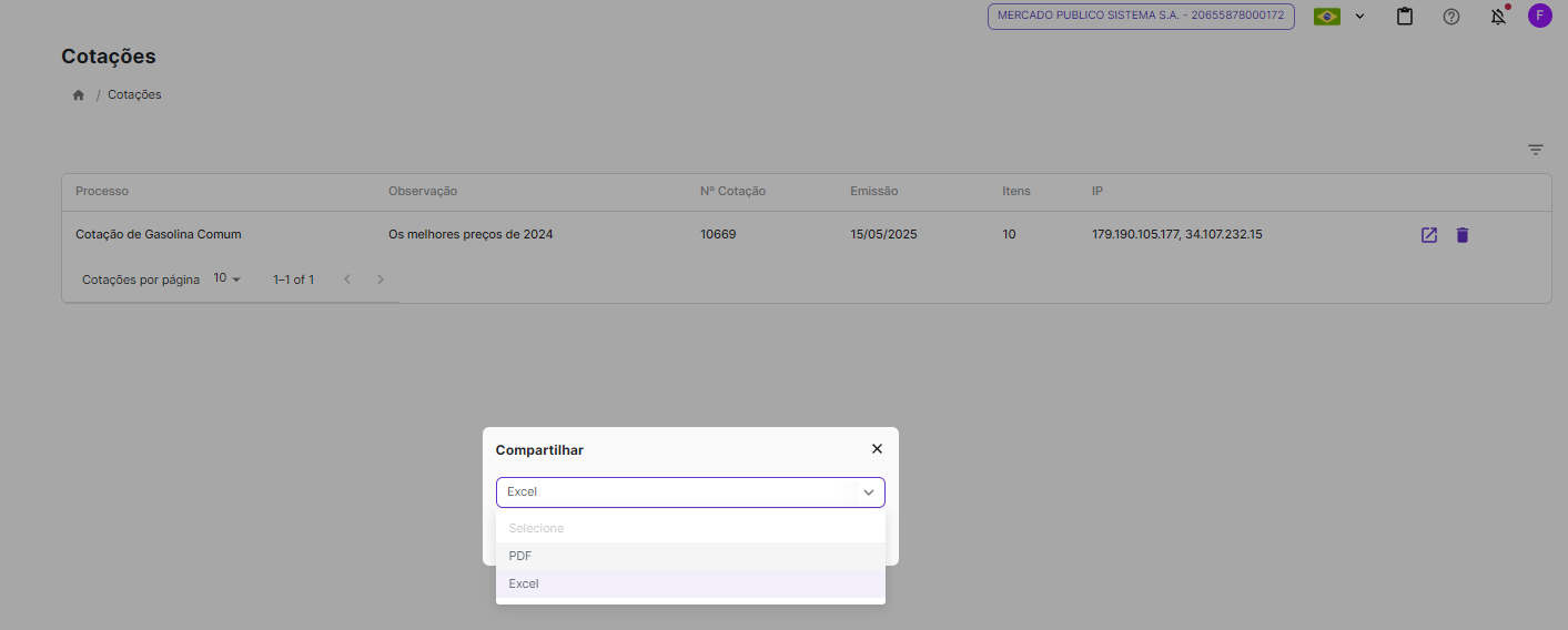 - Você pode compartilhar a cotação por Excel ou PDF.