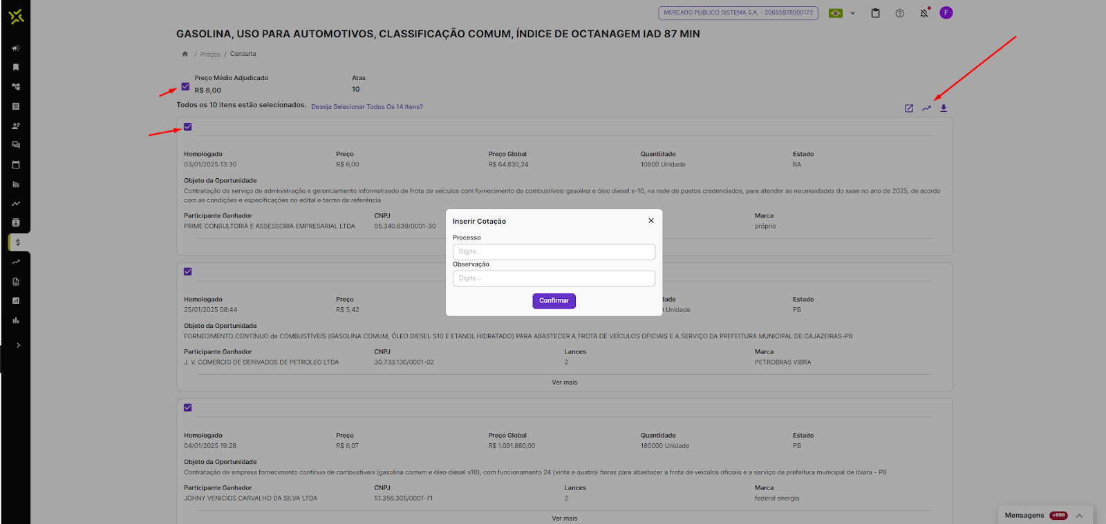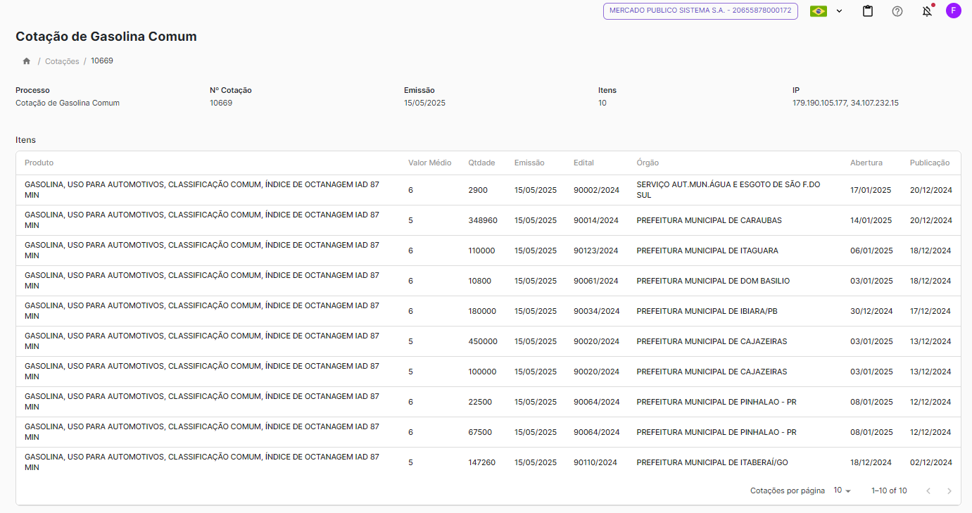 Pronto! Sua cotação será salva automaticamente na aba Cotações, localizada no menu lateral esquerdo, logo abaixo da aba Preços.